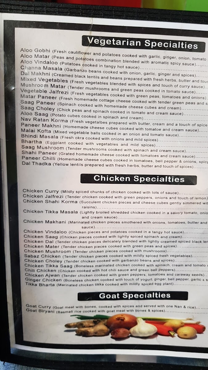 “ First time here. The food was delicious. Chicken Tikka Masals was great, lamb saag was good, but lamb a little chewy, lamb Korma was very good. Ordered garlic Nan, and they gave us free vegetable pakora on the side. Hubby was disappointed they didn't have hot onion chutney, but in its place had Frank's red hot in the triple condiment tray. However, the mint chutney and tamarind sauce were excellent. Mango Lassi was yummy, too. Our friend had goat curry, excellent choice with tender meat. Will return to get next time. Great food with great prices! ”